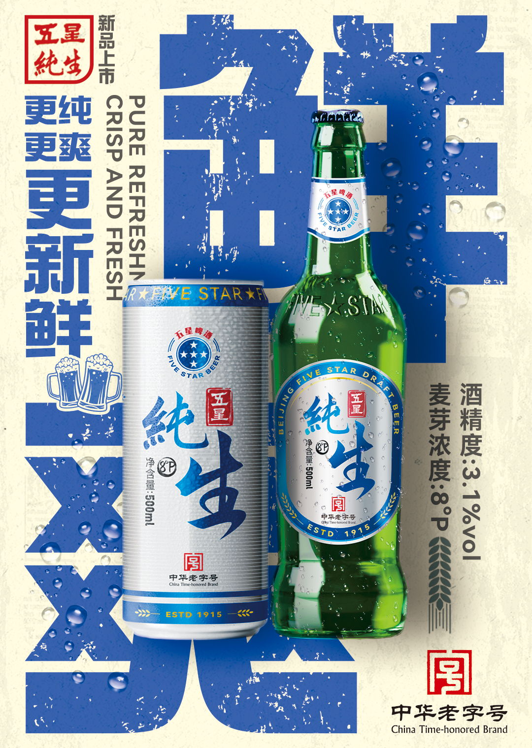 五星是百年北京老字號品牌,屬于北京雙合盛五星啤酒有限公司,“品質(zhì)至上,技藝精湛”是五星啤酒的釀造理念。